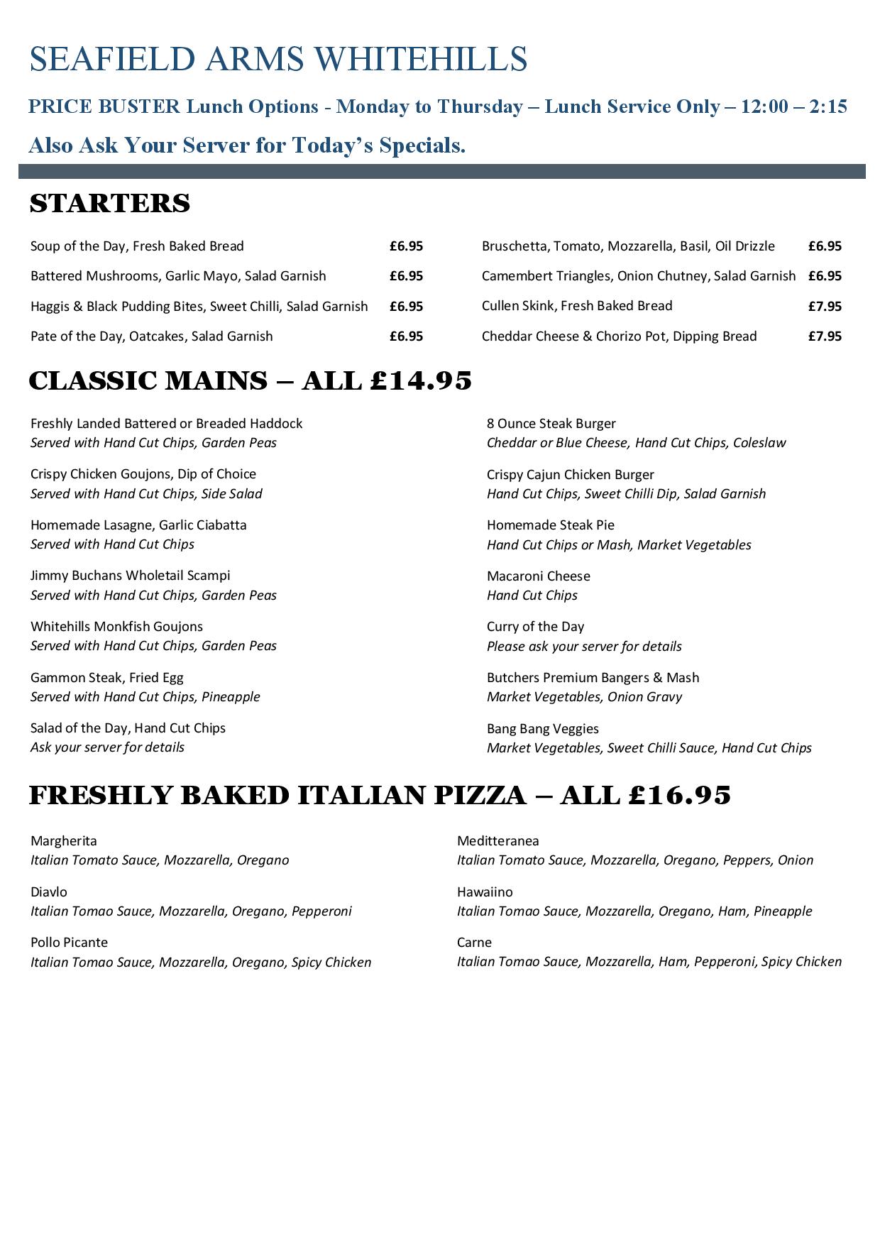 Price Buster Menu Monday to Thursday